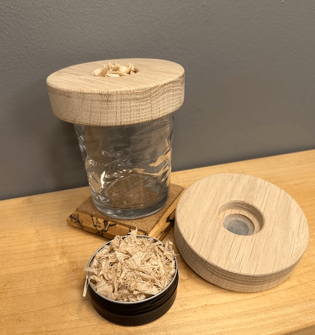 This kit includes the white oak smoker, a screen, and a tin of white oak wood shavings. You can source additional shavings for other unique flavor profiles, such as cherry, apple, and mesquite, just to name a few.