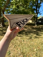 This design features a traditional paper airplane with pyropgraphied details and word Fuck.