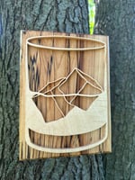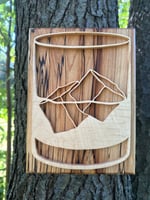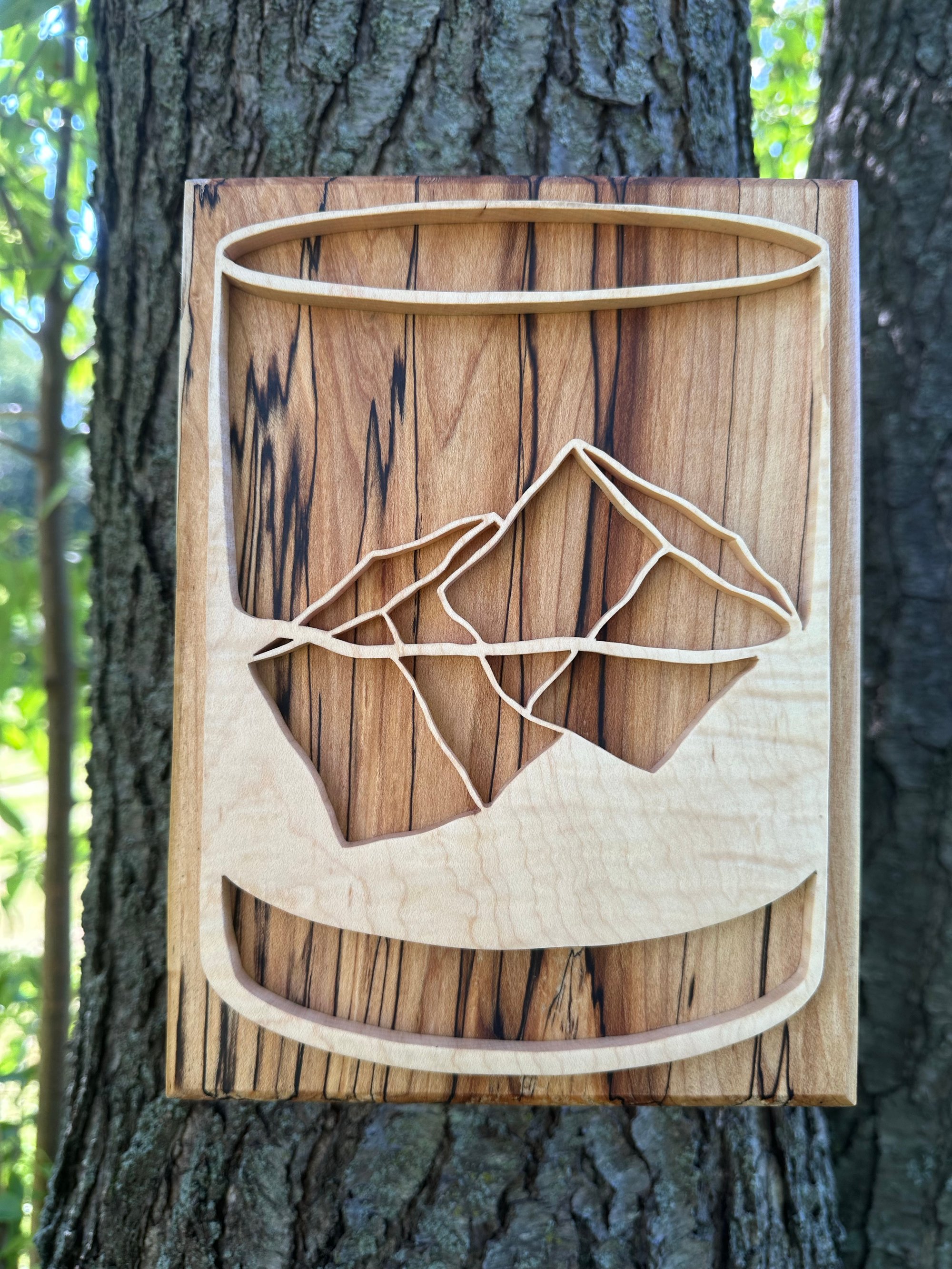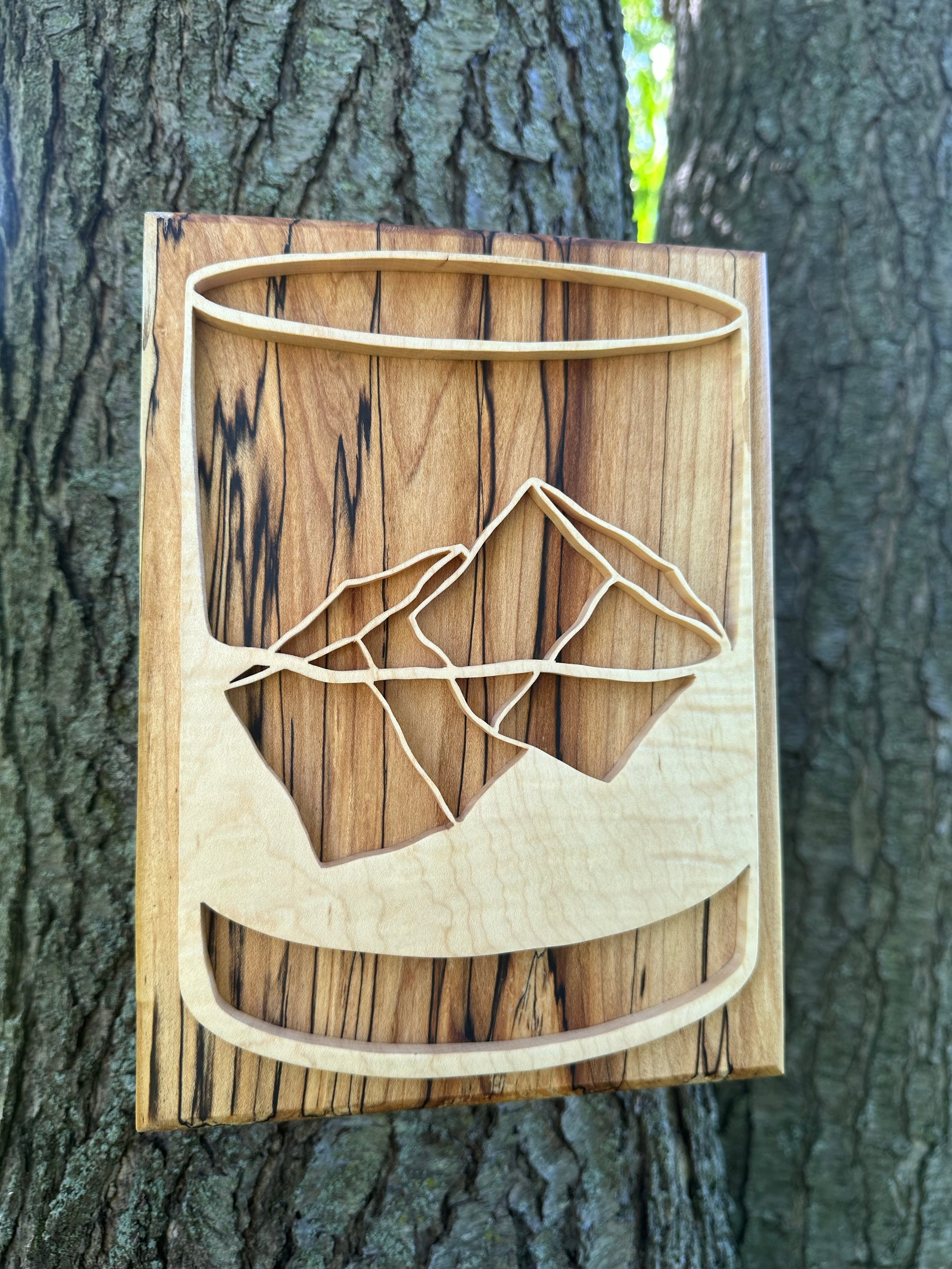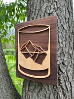 Made from locally sourced hardwoods such as maple and walnut, the whiskey glass and ice outlines were hand cut and shaped, making this piece truly a unique piece of art.